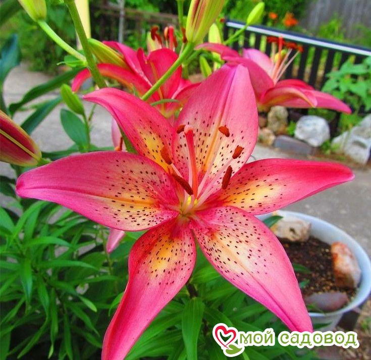 Цветы розового цвета, у горла пастельно-желтые пятна с темными вкраплениями. Без аромата. Диаметр цветка 15 см. Период цветения: июнь/июль. Высота растения достигает 100 см. Сорт достаточно неприхотлив и морозоустойчив. Уход за лилиями включает в себя прополки, поливы, рыхления, подкормки, борьбу с болезнями и вредителями. Поливают лилии в период цветения, поддерживая почву в увлажненном состоянии. Чтобы избежать пересыхания и перегрева почву мульчируют перегноем или торфом слоем в 5-6 см. Лилии хорошо отзываются на подкормки. Первую подкормку проводят весной после схода снега, разбрасывая по поверхности почвы азотные удобрения. Во время бутонизации растения поливают растворенной в воде аммиачной селитрой, непосредственно перед цветением использую фосфорно-калийные удобрения в жидком виде, в конце лета, но не позднее середины августа, лилии подкармливают фосфором и калием. Выращивать лилии на одном месте дольше 3-4 лет крайне нежелательно: луковица нарастает, становится рыхлой, растениям становится тесно по соседству. На 5 -6 год заметно снижается высота цветоноса, количество бутонов и значит, луковица истощена, а это может привести к заболеваниям и гибели растения. Осенью, когда надземная часть растения отмерла, стебель обрезают на высоте 15 см от поверхности почвы, гнездо выкапывают целиком, отделяют от материнской луковицы детки и высаживают их на доращивание. Саму материнскую луковицу пересаживают на новое место. В нашем интернет-магазине вы сможете купить Лилии Так же возможно вас заинтересуют Лилия-дерево Пурпл Принц и Лилия (ЛО-гибрид) Пинк Хевен